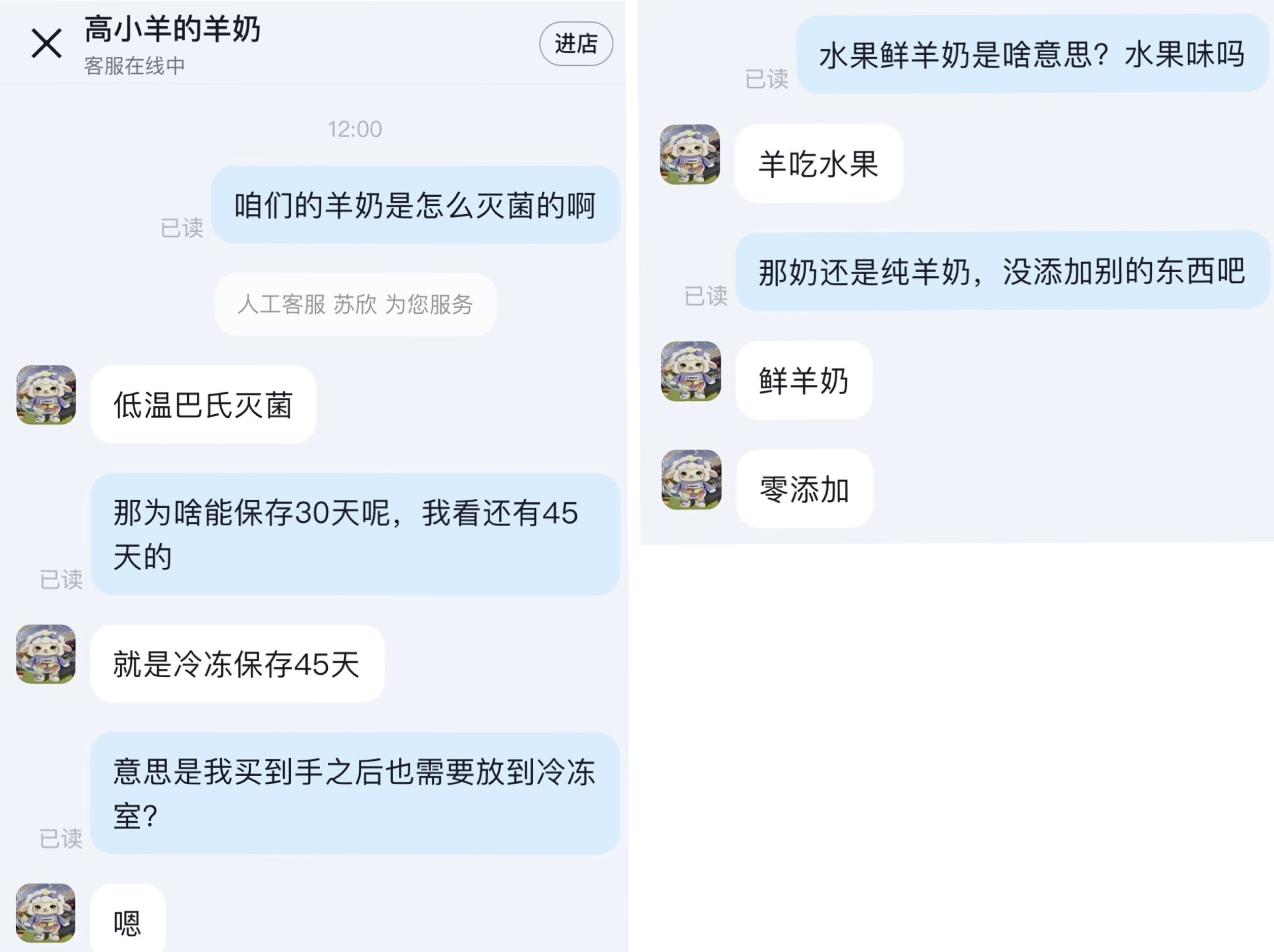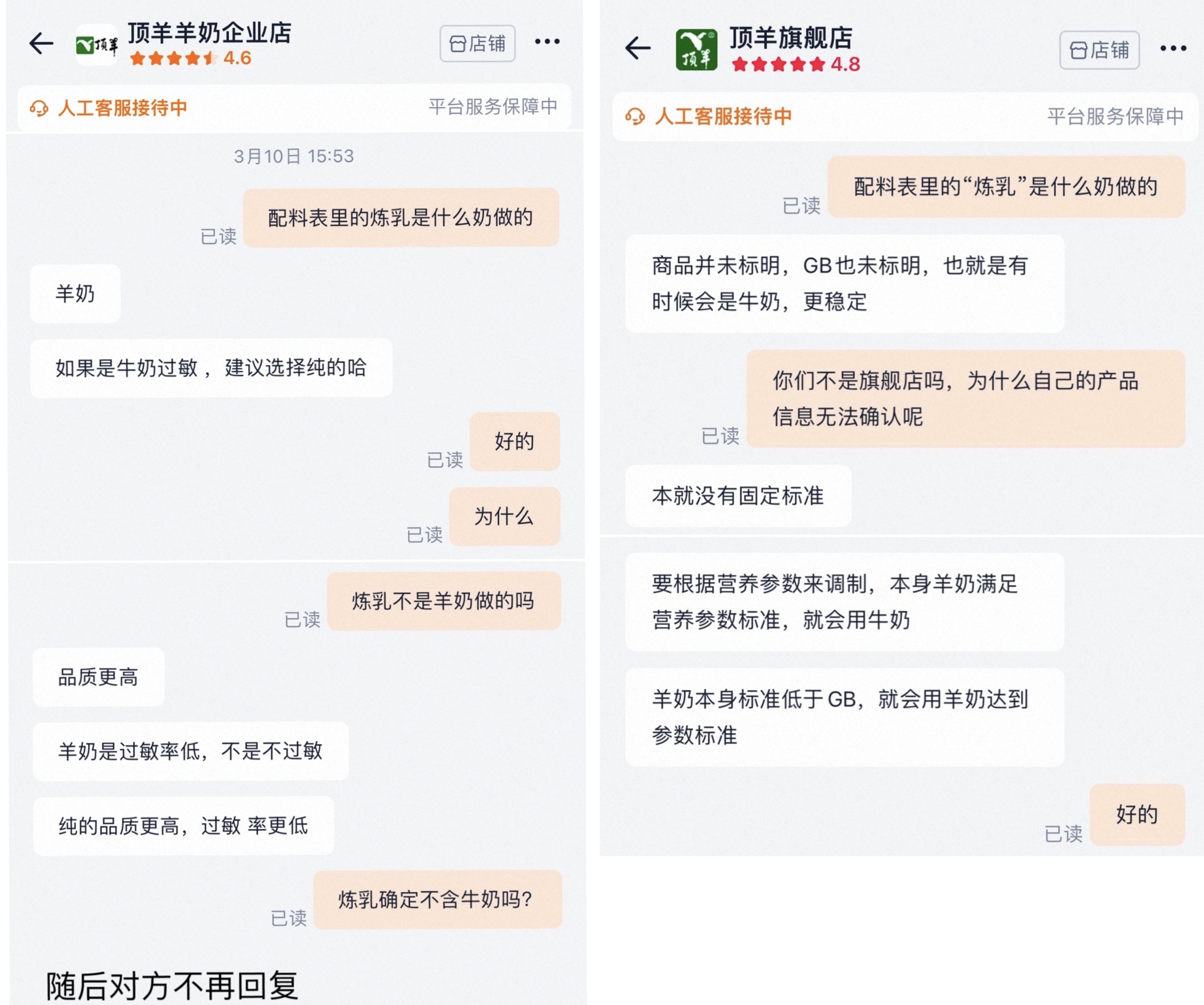 界面新闻在其电商店铺咨询时,所用炼乳是由羊乳还是牛乳制作的。但客户回答比较模糊,甚至出现了“前后矛盾”的情况。在同为顶羊品牌的不同电商店铺,一位客服表示炼乳是羊乳制作,但牛乳过敏请不要选择。另一位客服则表示,“(炼乳)有时候是牛奶”。