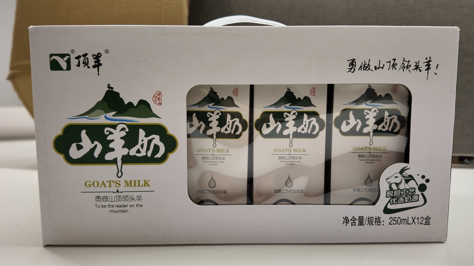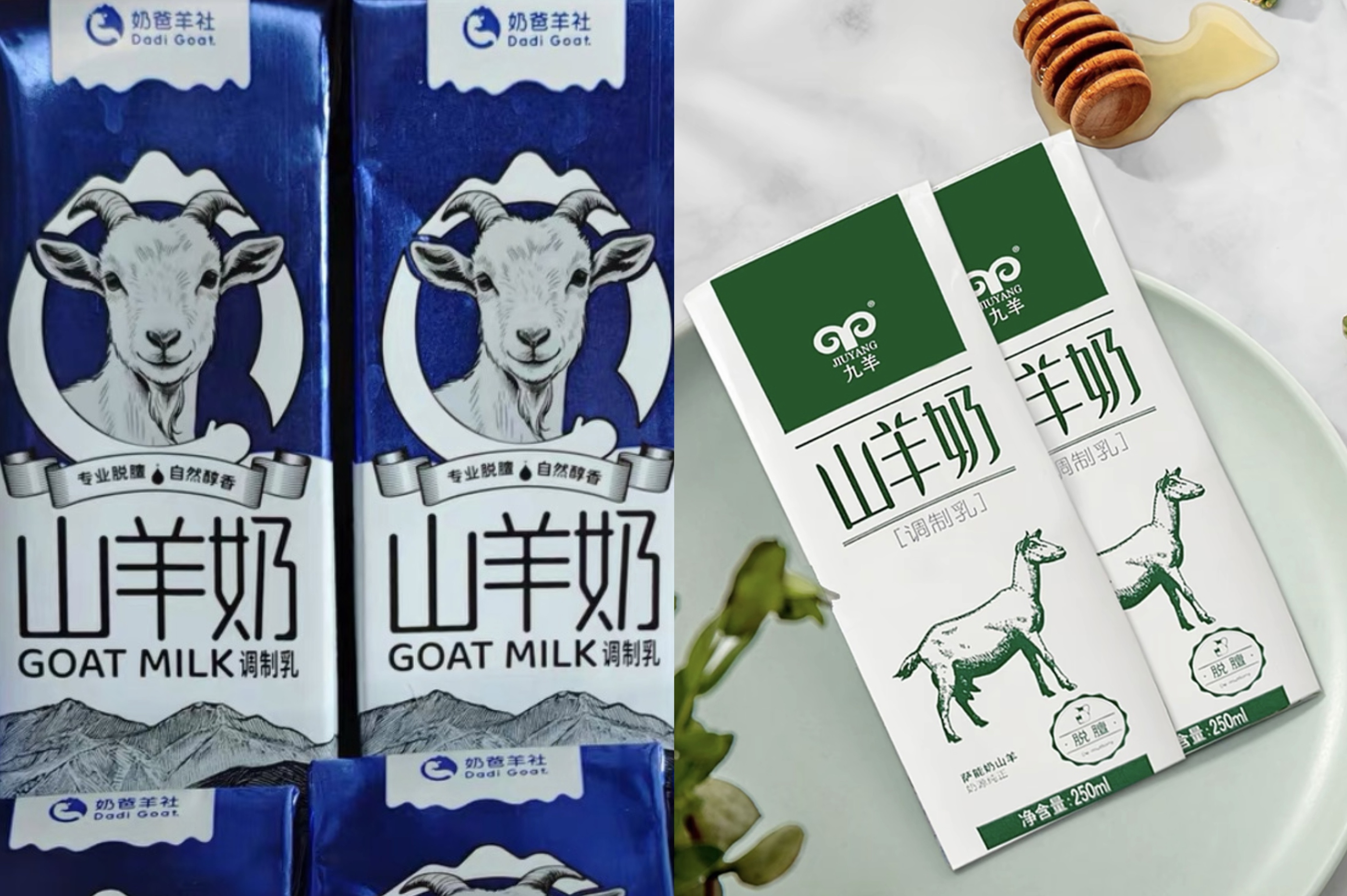 以市面上较为常见的“顶羊”为例,其包装上写着“山羊奶”字样,而配料里则显示包含了生羊乳和炼乳。