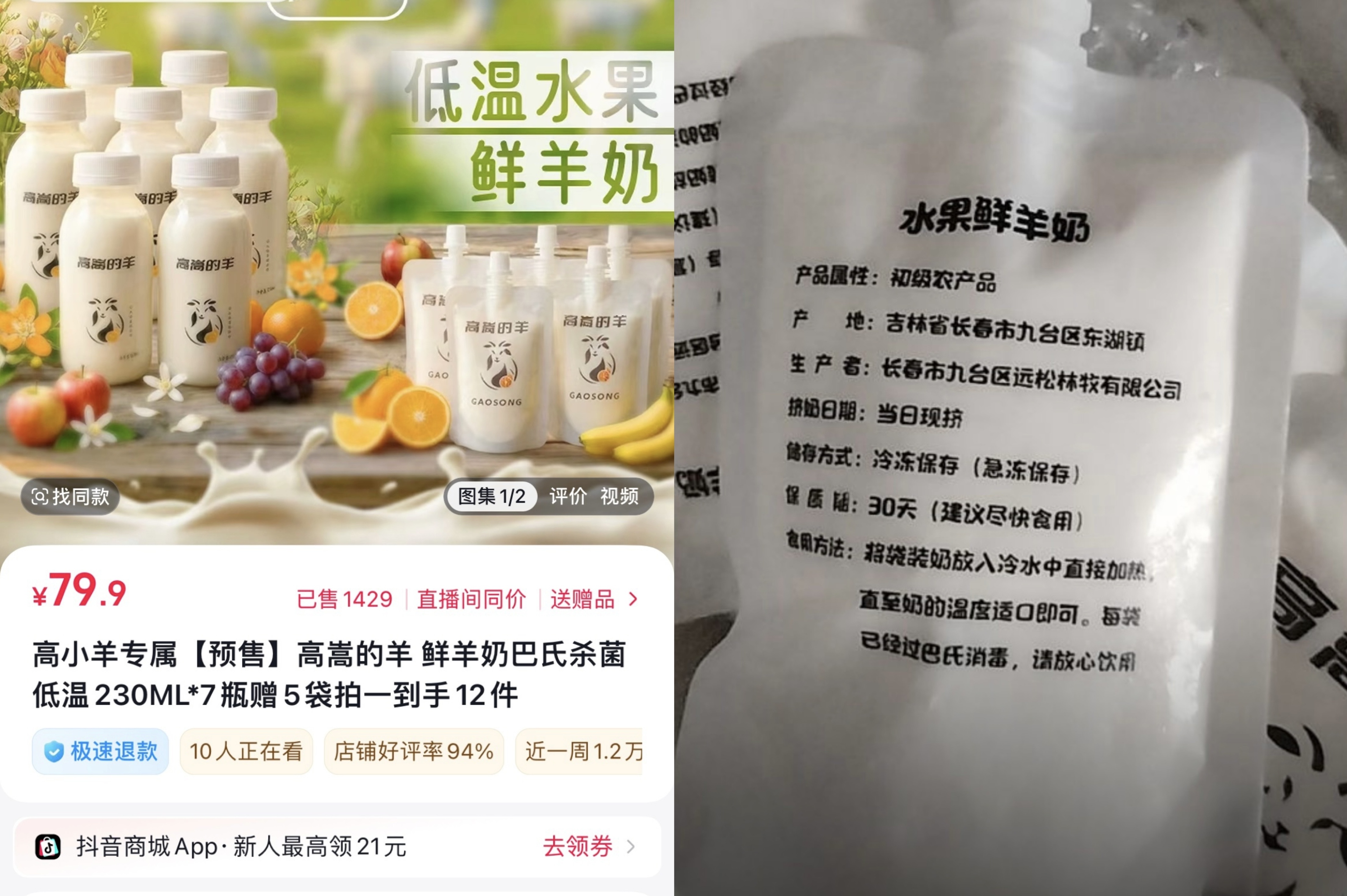 包装背面的标签部分,印有一行较大字体的“水果鲜羊奶”。在其直播间中,主播也以“鲜羊奶”名义进行推广。但记者查阅其包装发现并未标注配料表,因此无法核实“鲜羊奶”的真实性(即配料是否仅为生羊乳),而“水果”成分更是无从体现。